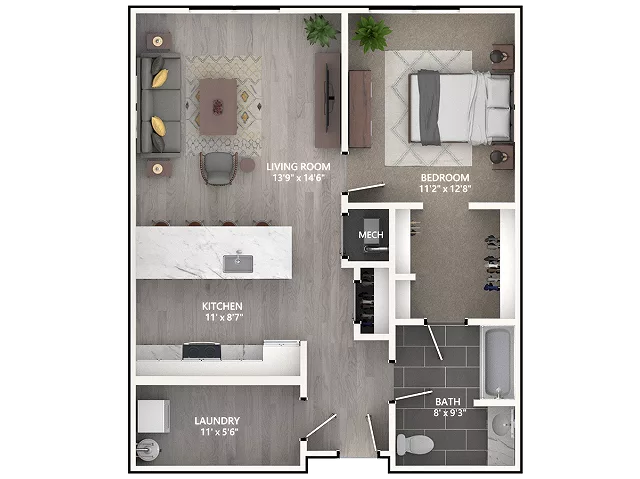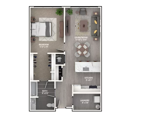 Rendering of the A6 floor plan with 1 bedroom[s] and 1 bathroom[s] at Emerson