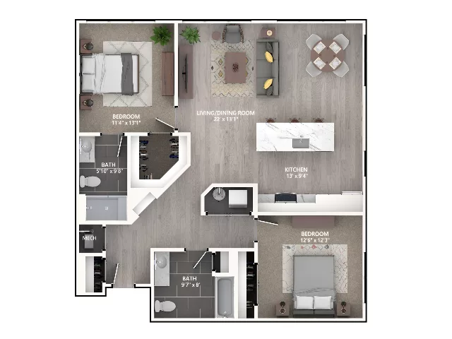 Rendering of the B5 floor plan with 2 bedroom[s] and 2 bathroom[s] at Emerson
