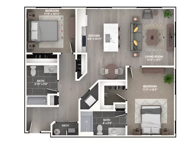 Rendering of the B8 floor plan with 2 bedroom[s] and 2 bathroom[s] at Emerson